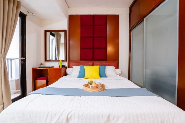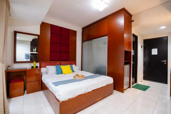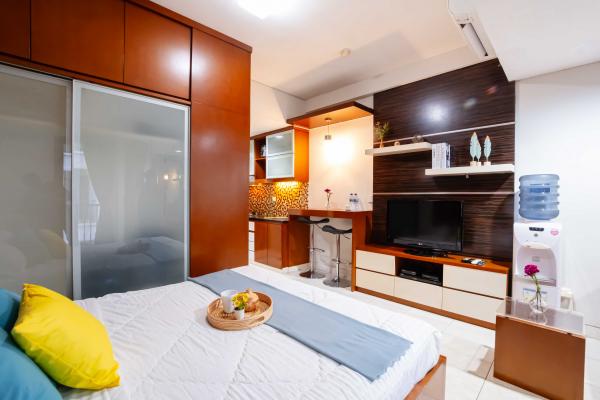 Condition: Minimalist studio room & fully furnished with access card, AC, kulkas, TV, Kitchen set, water heater, Queen size bed, sliding cabinet, working desk